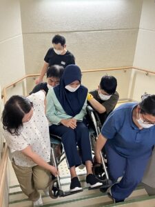 垂直避難では停電によりエレベーターが使用できない状況を想定し、階段から上階へ車椅子や寝たきりの入居者様の避難を行いました。4人1組のグループで実施し、少ない人数で車椅子やシートで避難を行うことの大変さを感じ、災害の予測と早期対応の必要性を実感できる訓練となりました。