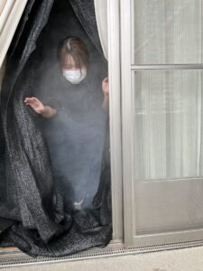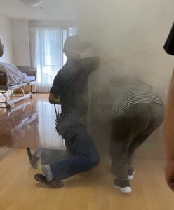 また、今回は煙中講習も行い実際に居室内に煙を充満させた部屋を通り抜ける体験をしました。